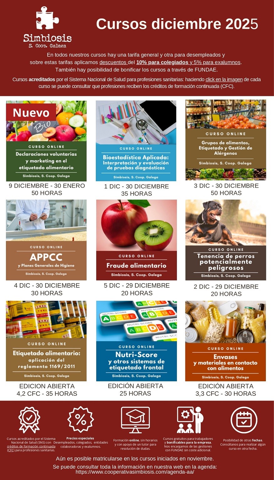 • NUEVO CURSO “DECLARACIONES VOLUNTARIAS Y MARKETING EN EL ETIQUETADO ALIMENTARIO” Fecha: 9 diciembre - 30 enero 50 HORAS LECTIVAS Enlace Matricula • CURSO “BIOESTADÍSTICA APLICADA: INTERPRETACIÓN Y EVALUACIÓN DE PRUEBAS DIAGNÓSTICAS” Fecha: 1 diciembre - 30 diciembre 35 HORAS LECTIVAS Enlace Matricula • CURSO “TENENCIA DE PERROS POTENCIALMENTE PELIGROSOS” Fecha: 2 diciembre - 29 diciembre 20 HORAS LECTIVAS Enlace Matrícula • CURSO “GRUPOS DE ALIMENTOS, ETIQUETADO Y GESTIÓN DE ALÉRGENOS” Fecha: 3 diciembre - 30 diciembre 50 HORAS LECTIVAS Enlace Matrícula • CURSO “APPCC Y PLANES GENERALES DE HIGIENE” Fecha: 4 diciembre - 30 diciembre 30 HORAS LECTIVAS Enlace Matrícula • CURSO “FRAUDE ALIMENTARIO” Fecha: 5 diciembre - 29 diciembre 20 HORAS LECTIVAS Enlace Matrícula